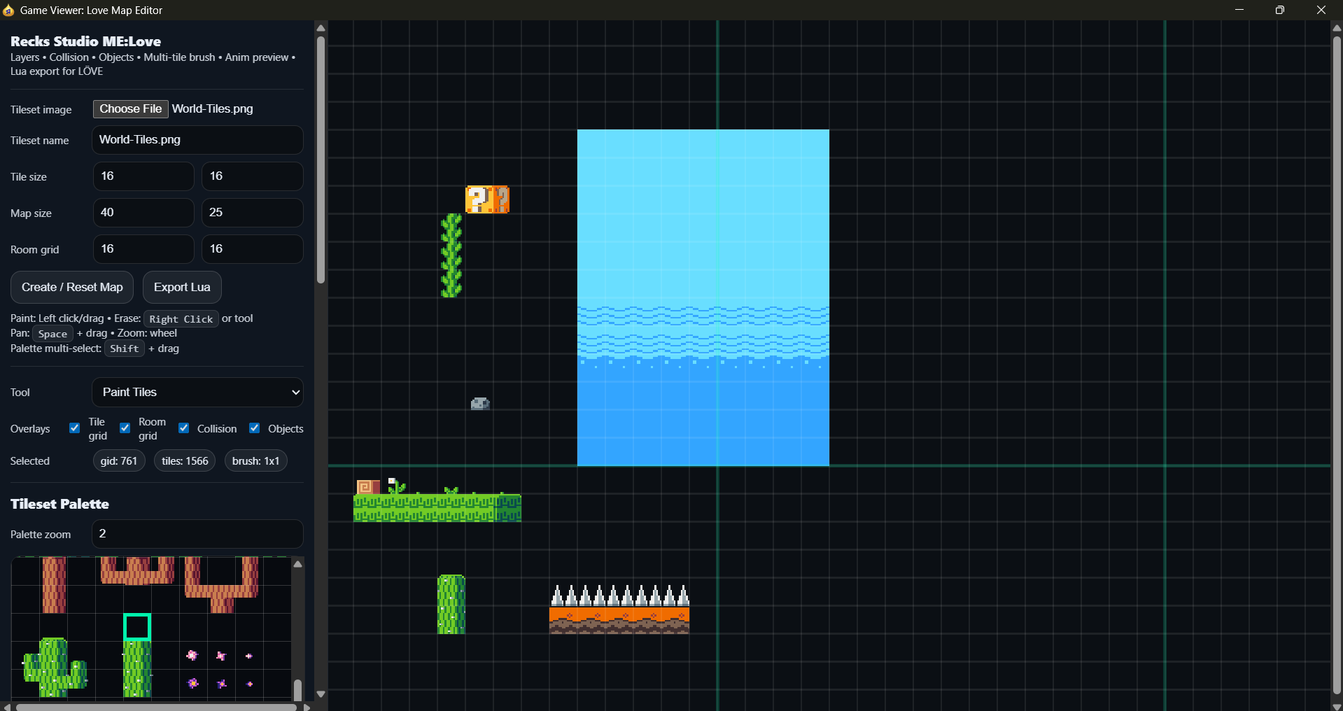 Recks Studio ME:Love — Phaser 3 Map Editor is a lightweight 2D tilemap editor for building room-based maps fast. Load a tileset, paint multiple layers, mark collision, drop simple objects, and export everything as a Lua table you can read directly in your game. It’s built for pixel-art workflows and quick iteration.